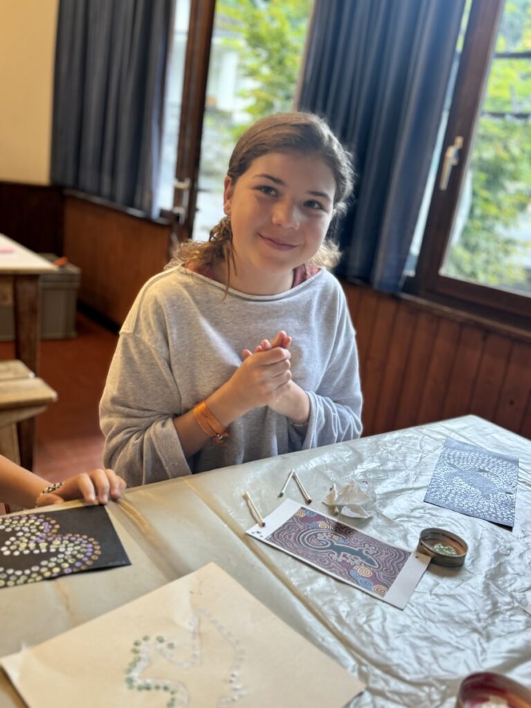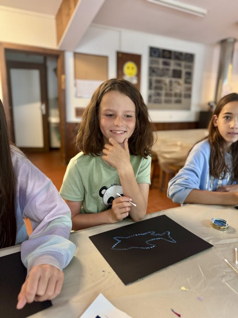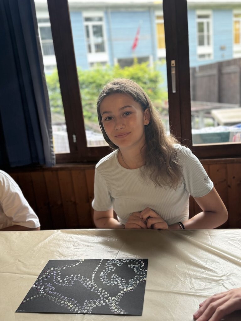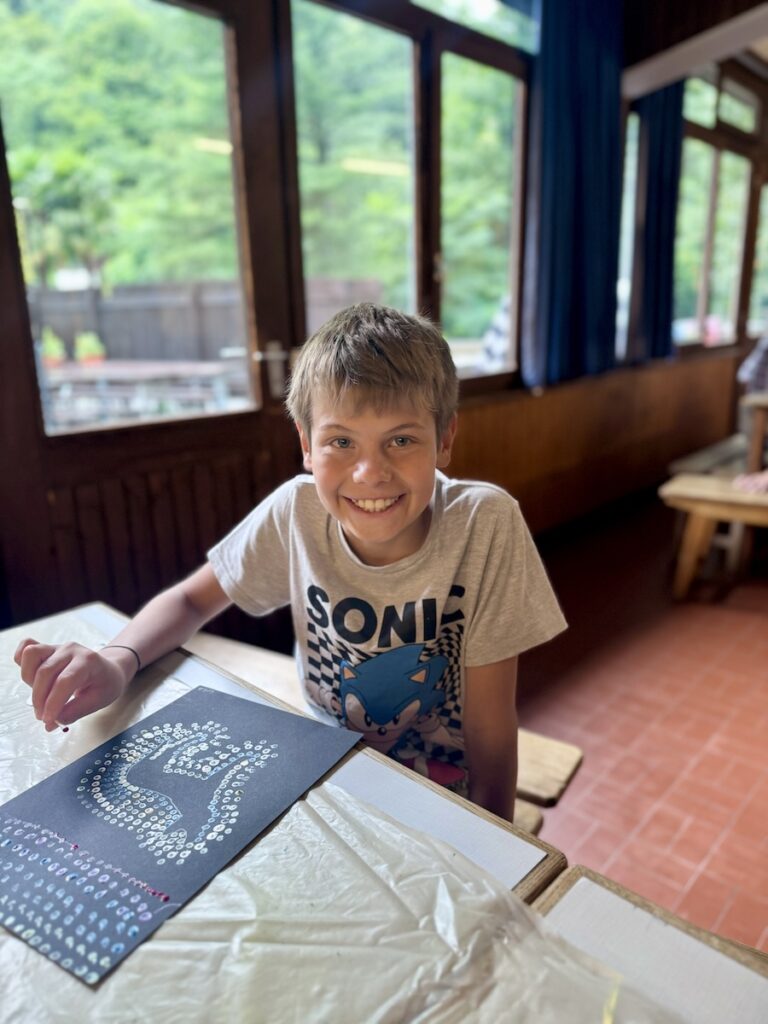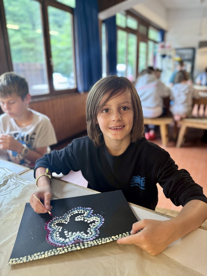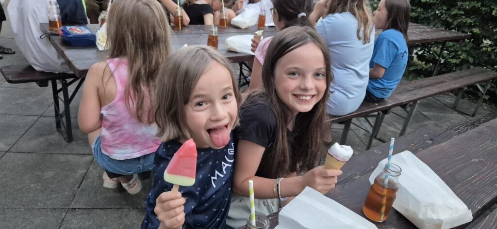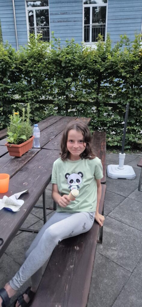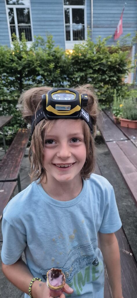 Wir sind aufgestanden. Danach zogen wir uns an. Später assen wir zu Morgen. Wir durften Geschichten hören und malen. Danach assen wir zu Mittag und nach dem Essen hatten wir Freizeit. Nach der Freizeit haben wir gebastelt und Sport gemacht. Zwischen den Aktivitäten haben wir gegessen. Dann hatten wir Freizeit. Dann assen wir zum Abendessen. Danach hatten wir Freizeit. Danach schauten wir einen Film. Zwischen dem Film gab es eine kurze Pause mit Essen (Glacé und Popcorn). Nach dem Film ging der schöne Tag zu Ende. (Enea, Lara)