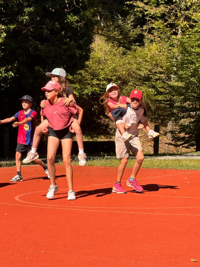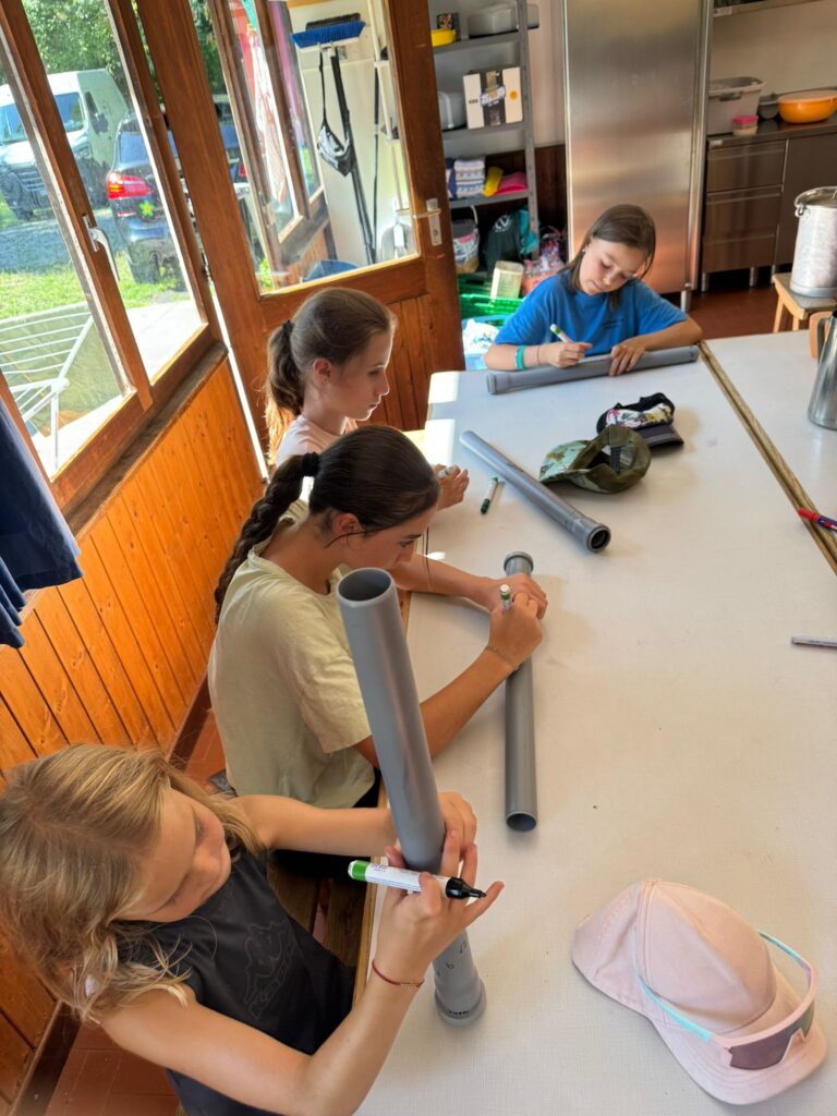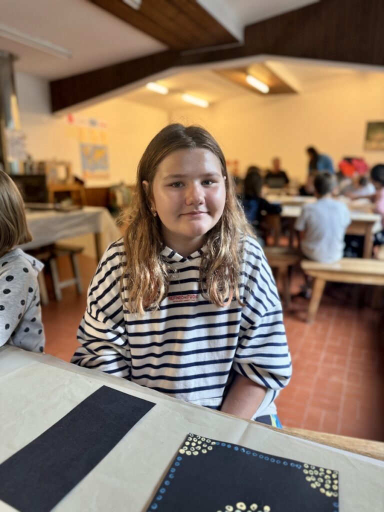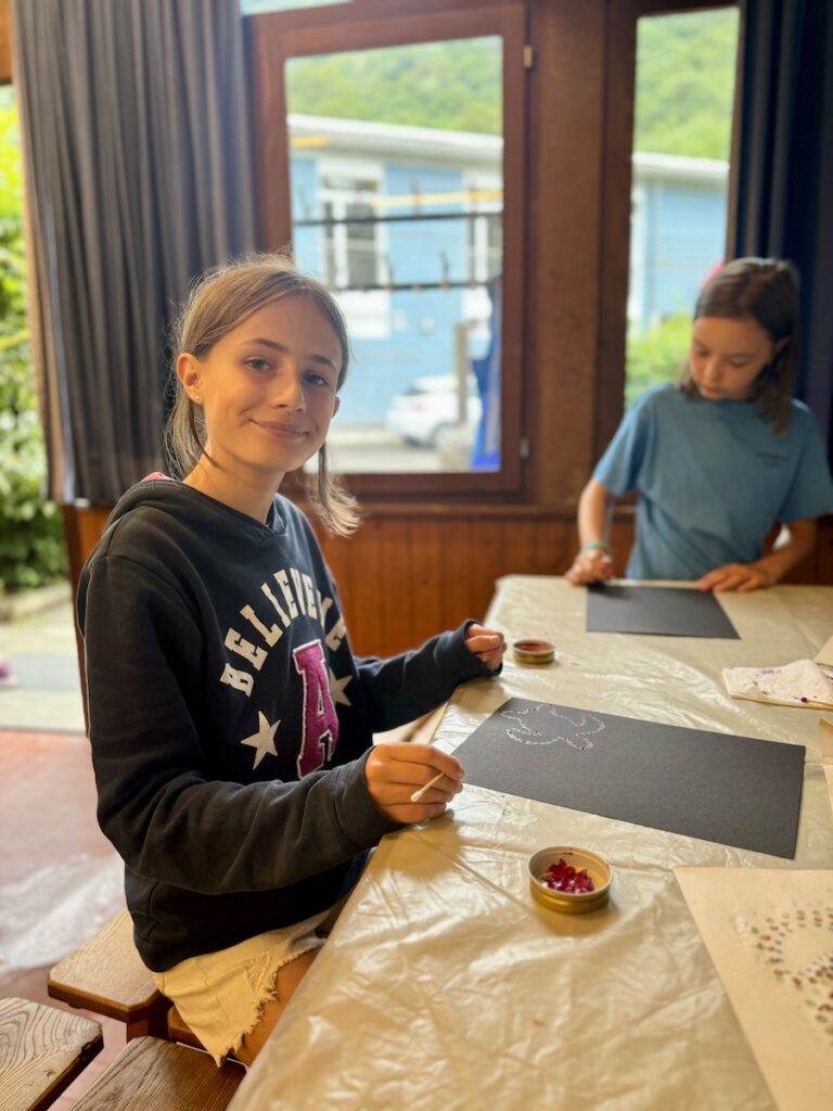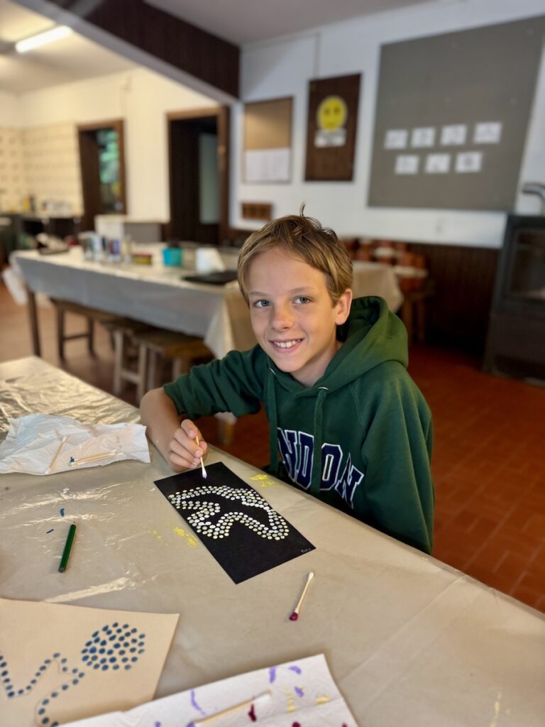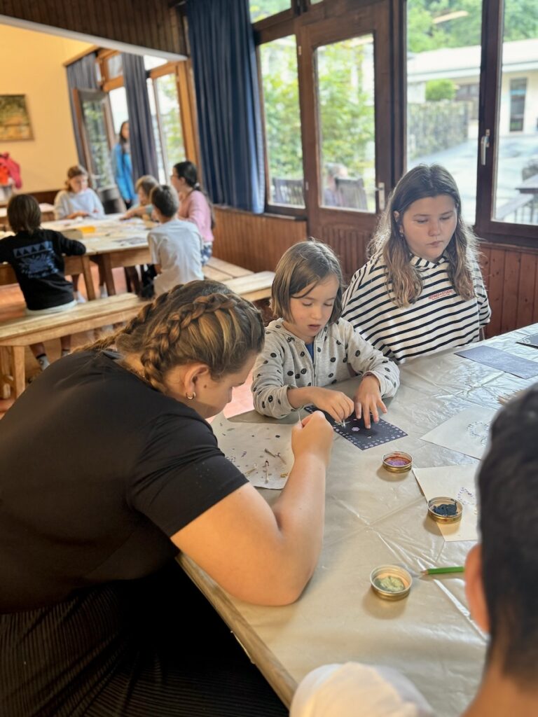 Wir sind aufgestanden. Danach zogen wir uns an. Später assen wir zu Morgen. Wir durften Geschichten hören und malen. Danach assen wir zu Mittag und nach dem Essen hatten wir Freizeit. Nach der Freizeit haben wir gebastelt und Sport gemacht. Zwischen den Aktivitäten haben wir gegessen. Dann hatten wir Freizeit. Dann assen wir zum Abendessen. Danach hatten wir Freizeit. Danach schauten wir einen Film. Zwischen dem Film gab es eine kurze Pause mit Essen (Glacé und Popcorn). Nach dem Film ging der schöne Tag zu Ende. (Enea, Lara)